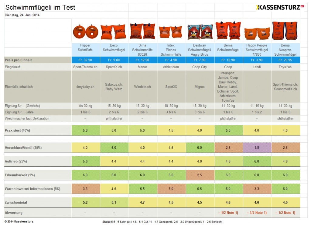 Das Labor hat in einem Praxistest die Schwimmhilfen durch Eltern von Kindern unterschiedlichen Alters bewerten lassen (Gewichtung Schwimmflügel 40%, Schwimmsitze 25%). Die Prüfpunkte im Labortest nach der gültigen Europäischen Norm EN 13138–1:2008: