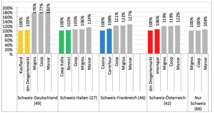 Im innerschweizerischen Vergleich liegen Migros und Coop in etwa gleich auf, Manor ist rund 4 Prozent teurer als die beiden Detailhandelsriesen. Im Zeitraum von August 2012 bis August 2014 sind die Preise für Kosmetikartikel in der Schweiz bei allen drei untersuchten Detailhändlern gesunken: bei Coop um rund 5%, bei Manor um 6% und bei der Migros um rund 7%. Bei den deutschen und französischen Händlern sind die Preise allerdings teilweise noch stärker gesunken, in Italien sind sie mehrheitlich gestiegen und in Österreich verharrten sie auf dem selben Niveau. Die detaillierten Resultate finden Sie im Factsheet und auf preisbarometer.ch