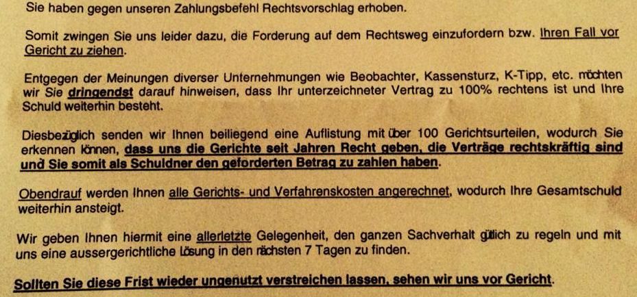 Aktuell versucht Business Academy durch harsche Briefe ihres Inkassobüros Fairpay GmbH die Betroffenen einzuschüchtern: “Sollten Sie diese Frist wieder ungenutzt verstreichen lassen, sehen wir uns vor Gericht.” Wer eine solche Zahlungsaufforderung der Fairpay erhält, sollte sich auf keinen Fall einschüchtern lassen (siehe auch “Kassensturz”-Bericht vom 16.10.2014).