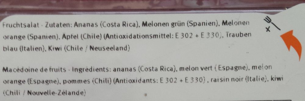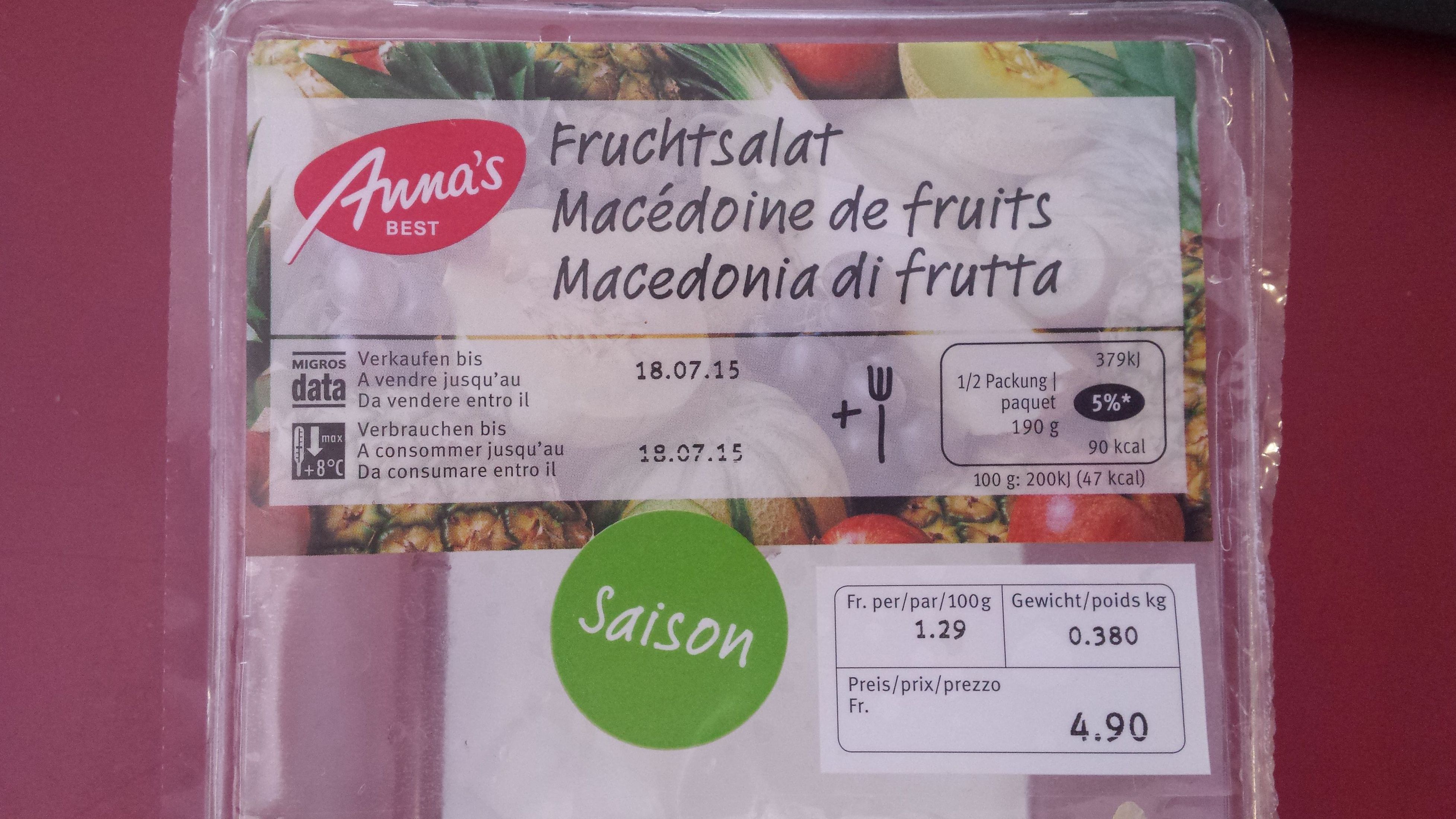 Gross und grün prangt “Saison” auf dem Fruchtsalat. Und eigentlich, so dünkt es einem, ist das mitten im Sommer durchaus möglich, einen Fruchtsalat mit saisonalen Früchten zuzubereiten. Wer allerdings die Rückseite beachtet, kommt ins Staunen: Keine einzige Frucht kommt aus der Schweiz.