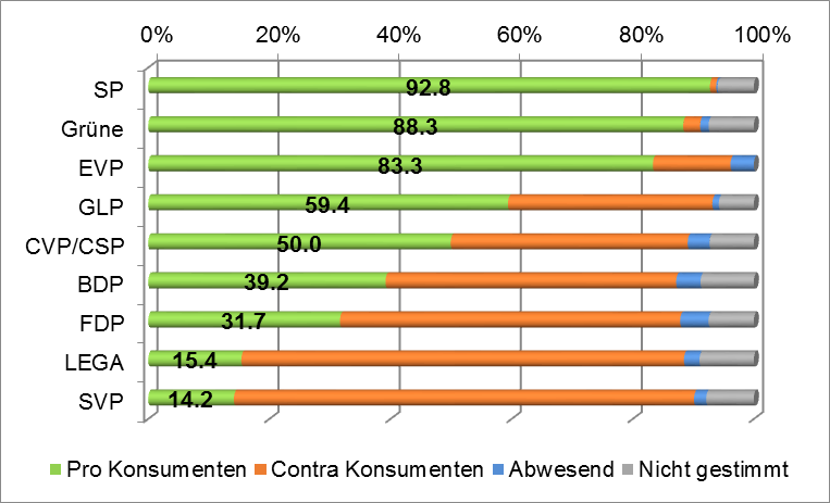 Untenstehende Tabelle zeigt, dass die SP-Parlamentarier zu rund 93% für die Anliegen der Konsumenten gestimmt haben. Auf Rang 2 folgen die Grünen. Deren Parlamentarier haben in 88.3% aller Fälle für die Konsumentenanliegen gestimmt. Auf den weiteren Plätzen folgen die EVP (83.3%), die Grünliberalen (59.4%), die CVP (50%), die BDP (39.2%), die FDP (31.7%) und die Lega dei Ticinesi (15.4%). Auf dem letzten Platz landet die SVP, deren Mitglieder stimmten nur in 14.2% der Fälle für die Anliegen der Konsumenten.