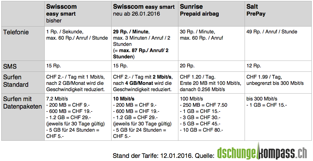 Die Swisscom teilte heute mit, dass sie per 26. Januar 2016 die Tarife ihres Prepaid-Abos “easy smart” anpasst.