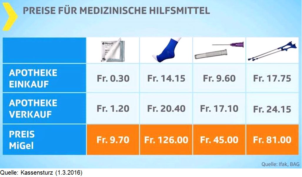 Ein Beitrag in der Sendung Kassensturz hat es einmal mehr gezeigt: Die Krankenkassen – und damit auch die Prämienzahler – müssen für medizinische Hilfsmittel wie zum Beispiel Gehhilfen, Prothesen oder Bandagen massiv überteuerte Preise bezahlen. Für Kompressen, welche im Einkauf 30 Rappen kosten, müssen Krankenkassen Fr. 9.70 vergüten. Für Fussbandagen zahlen Apotheken Fr. 14.15 und verlangen beim Verkauf ohne Rezept Fr. 20.40. Das BAG erlaubt allerdings einen Preis von sage und schreibe 126 Franken, wenn über die Krankenkasse abgerechnet wird. Es ist offensichtlich, dass da etwas schief läuft.