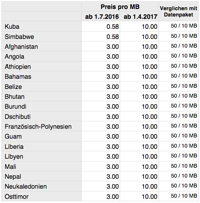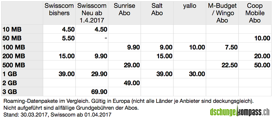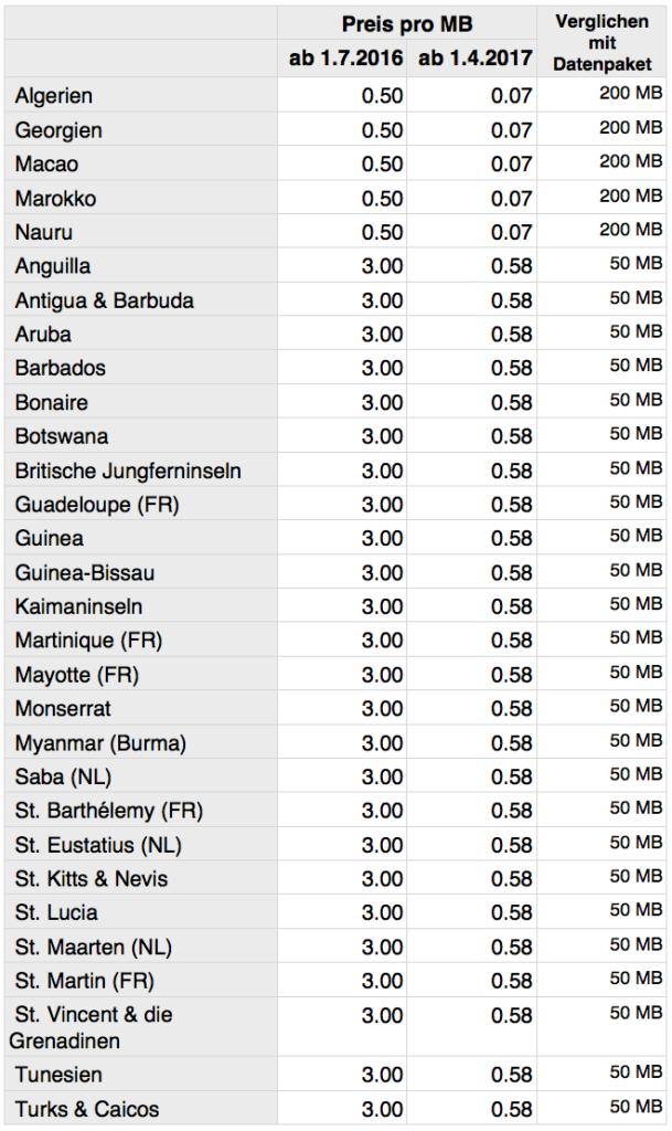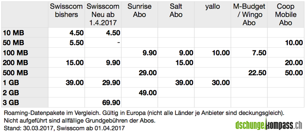 Ab 1. April 2017 gelten bei Swisscom neue Roamingtarife für Datenpakete. Das Surfen im Internet oder das Nutzen von Diensten, die auf dem Internet basieren (wie zum Beispiel Whatsapp), wird in eingen Ländern günstiger, in anderen teurer. Datenpakete sind eine Art Zusatzabonnement, das man vor einem Aufenthalt im Ausland lösen kann, um im Ausland das Internet günstiger zu nutzen als zum Standardtarif. Das sind die wichtigsten Tarifänderungen bei Swisscom (Quelle dschungelkompass.ch):