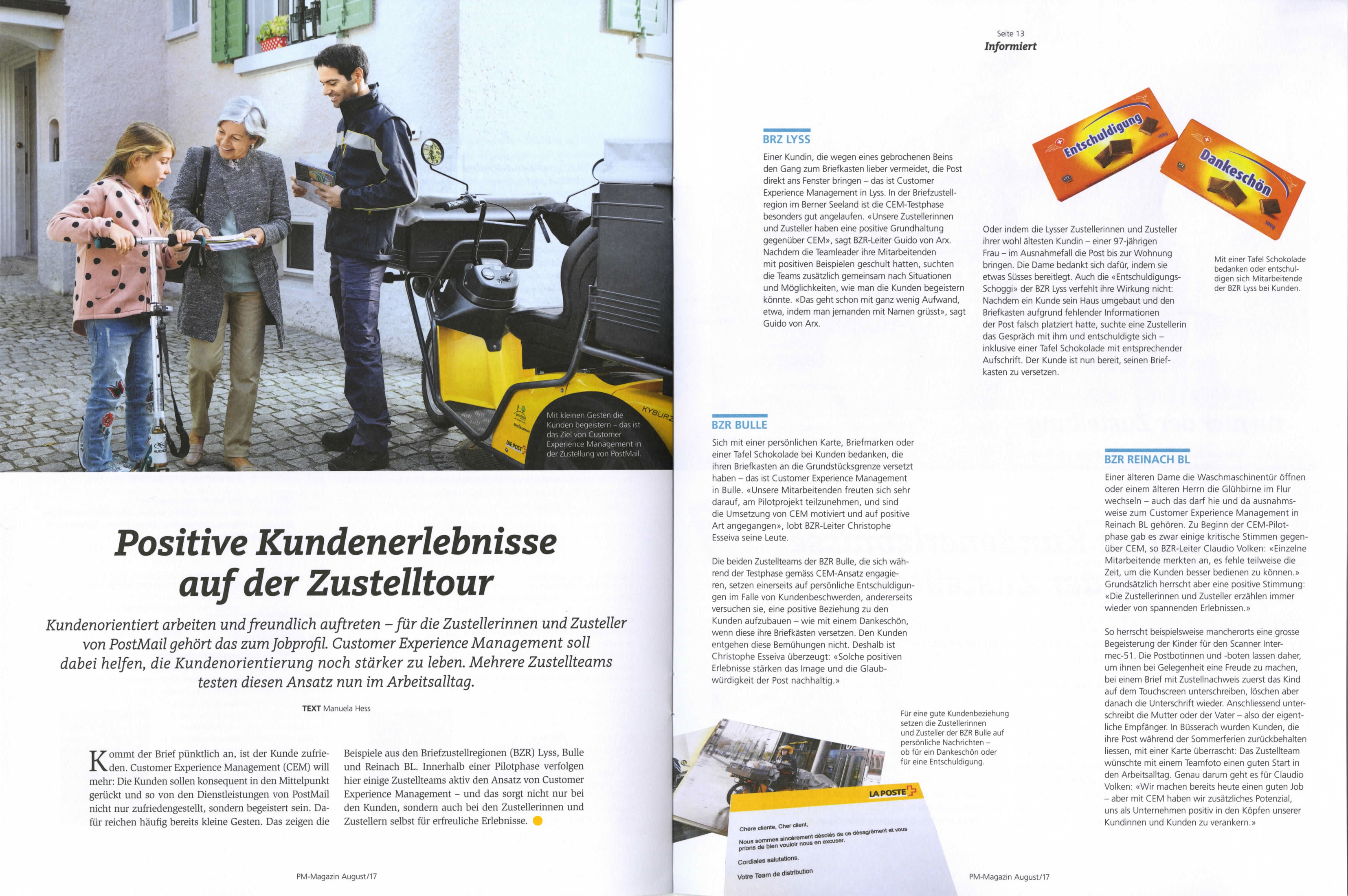 Den Kontakt zu den Kunden pflegen und zuvorkommend sein: Das will die Post den Zustellerinnen und Zustellern von Postmail (früher BriefträgerInnen) wieder ganz gezielt ans Herz legen. Und dies, nachdem man die Zusteller während Jahren mit der Stoppuhr auf ihre Tour geschickt und die Kunden mit peniblen Vorschriften drangsaliert hat. Jetzt spricht die Post in ihrem Postmail-Magazin von “Customer Experience Management” und wie Kunden und Zusteller doch erfreut darüber seien, dass die “Kunden konsequent in den Mittelpunkt” gestellt würden.