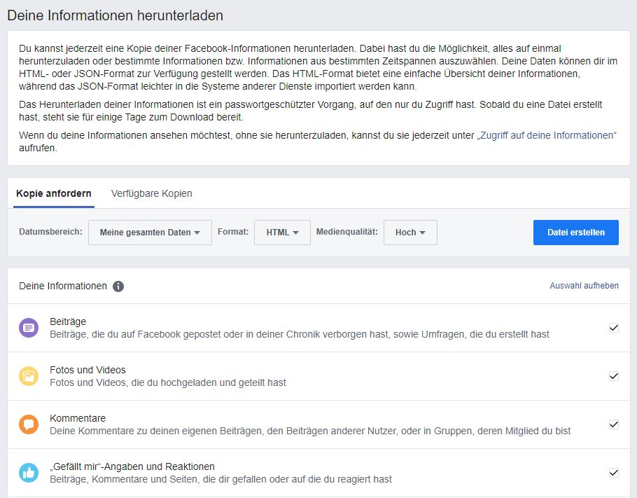 Einsicht in die Datensammlung des eigenen Profils auf Facebook