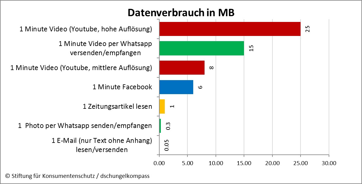 Welche Datenmenge Sie bei der Internetnutzung, bzw. dem Empfangen und Senden von Bildern, Videos, E-Mails, etc. verbrauchen, lässt sich im Voraus nicht exakt beziffern. Als Faustregel gilt: Videos verbrauchen mehr Daten als Bilder – Bilder brauchen mehr Daten als Text. Untenstehende Tabelle zeigt Ihnen den ungefähren Datenverbrauch in Megabyte für häufig genutzte Anwendungen, wobei insbesondere bei Facebook der Datenverbrauch stark schwanken kann.