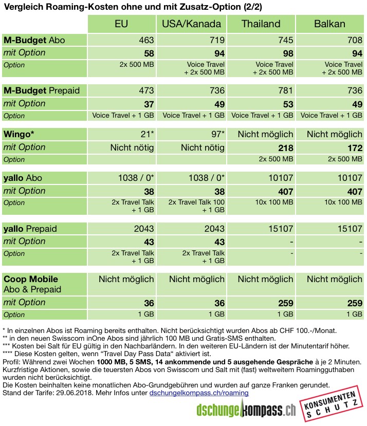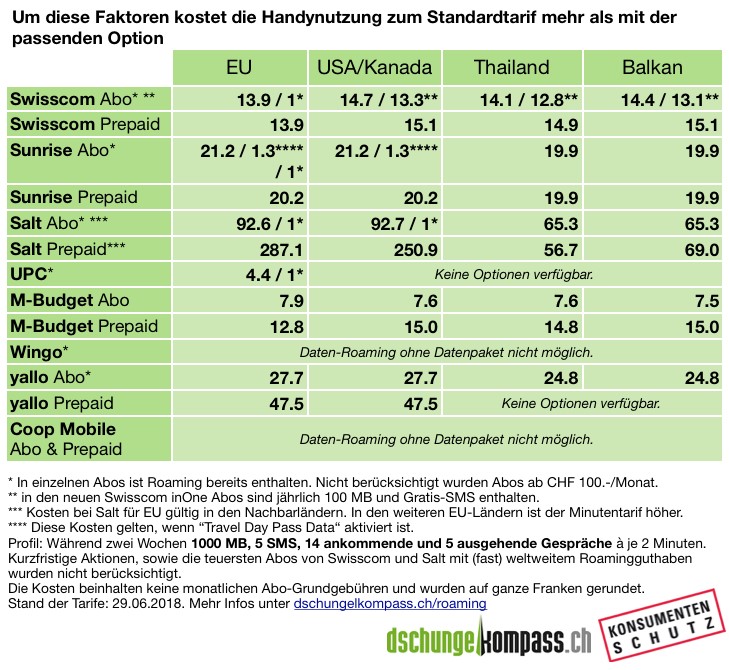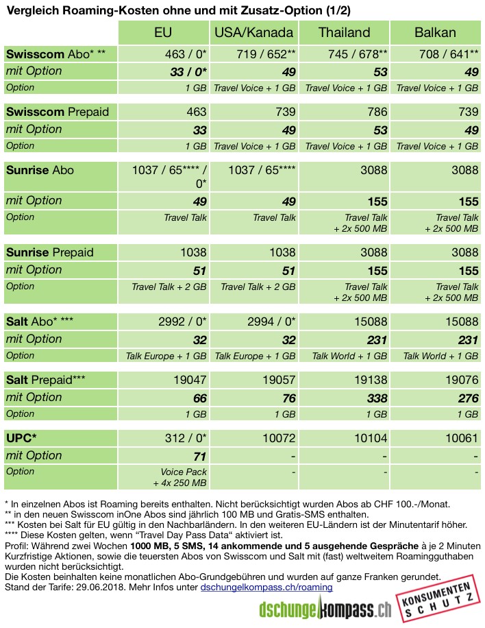 Wer die Sommerferien im Ausland verbringt und eine hohe Handy-Rechnung vermeiden will, sollte sich mit den Roaming-Tarifen und insbesondere den Roaming-Optionen beschäftigten: Im Extremfall kostet die Handynutzung mit dem normalen Tarif über 287 Mal mehr als mit einer Option. Der Konsumentenschutz und dschungelkompass.ch zeigen auf, welche Option für Sie die richtige ist und wie Sie diese kaufen können.