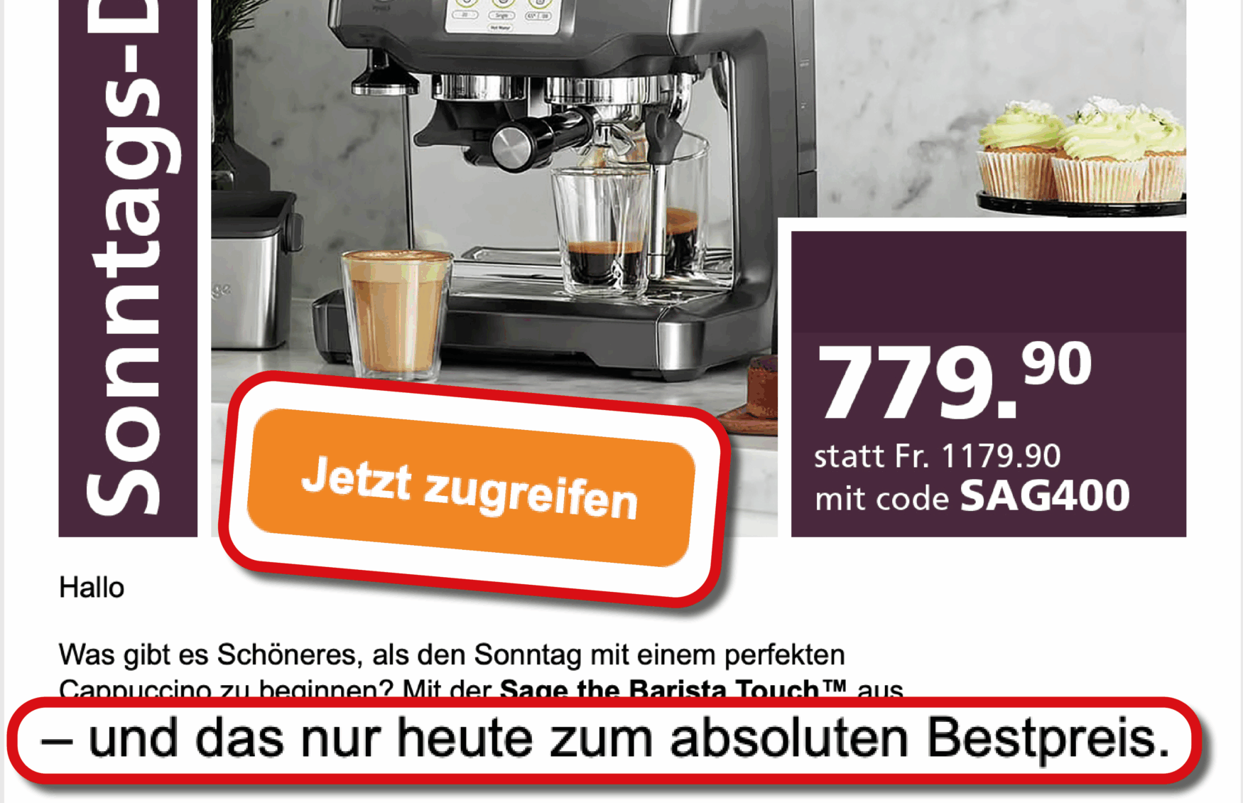 Mit Begriffen wie «nur heute zum absoluten Bestpreis» und «Sonntags-Deal» vermittelte Fust in ihrem Newsletter den Eindruck eines exklusiven, zeitlich streng limitierten Angebots. Nur wenige Tage später erschien dieselbe Aktion im neuen Fust-Prospekt, diesmal mit einem Rabatt, der über fast vier Wochen gültig ist. Das Bundesgesetz gegen unlauteren Wettbewerb (UWG) schreibt vor: Werbung muss transparent und wahr sein. Denn wenn ein Produkt über einen längeren Zeitraum verfügbar ist, dürfen Formulierungen nicht den falschen Eindruck erwecken, dass ein Angebot einmalig oder knapp ist.