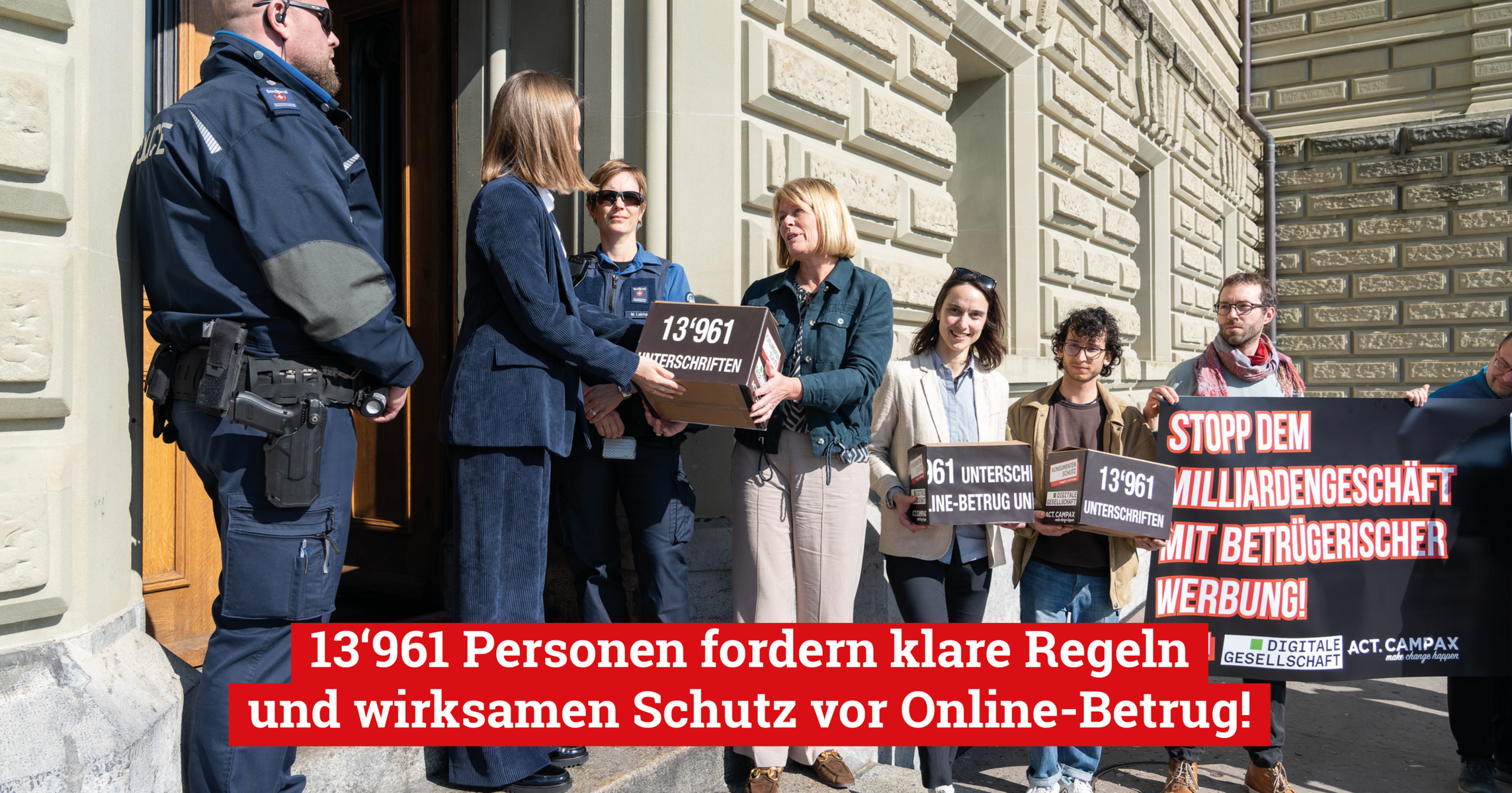 Genau hier setzen der Konsumentenschutz und die Digitale Gesellschaft an: Mit ihrer heute eingereichten Petition «Stopp dem Milliardengeschäft mit betrügerischer Werbung!» verlangen sie gemeinsam mit 13’961 Unterzeichner:innen, dass betrügerische Anzeigen einfach gemeldet und rasch entfernt werden können. Bundesrat Albert Rösti soll das Anliegen in die Gesetzesvorlage aufnehmen und Konsument:innen vor Betrug und Abzocke im Internet wirksam schützen.