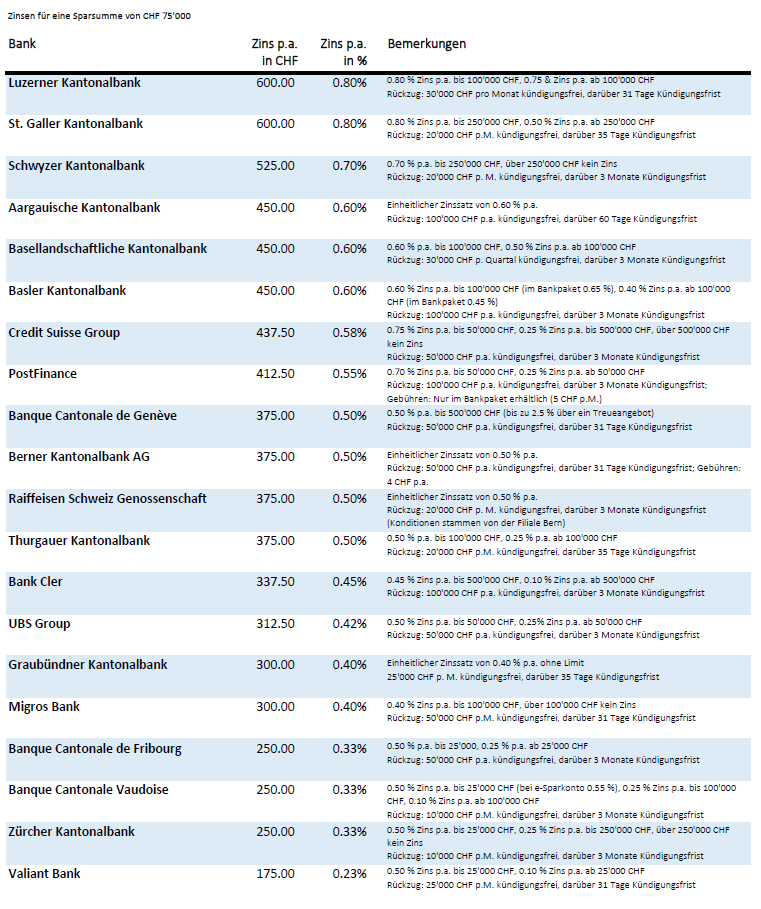 Die meisten Banken kennen je nach Kontostand unterschiedliche Zinssätze. Bei einer Einlage von 75’000 Franken bieten derzeit die Luzerner Kantonalbank und die St. Galler Kantonalbank mit 0.8% die attraktivste Verzinsung der im Vergleich berücksichtigten Banken. Auf den nächsten Plätzen finden sich ebenfalls vier Kantonalbanken. Die Spannbreite des Jahreszinses reicht von 600 bis 175 Franken. Kleinere Banken, die nicht im Vergleich berücksichtigt wurden, bieten teilweise eine höhere Verzinsung an. Bessere Konditionen gibt es oft auch bei speziellen Konten, wie zum Beispiel Jugend-, Senioren-, Mitglieder- oder Anlagesparkonten.