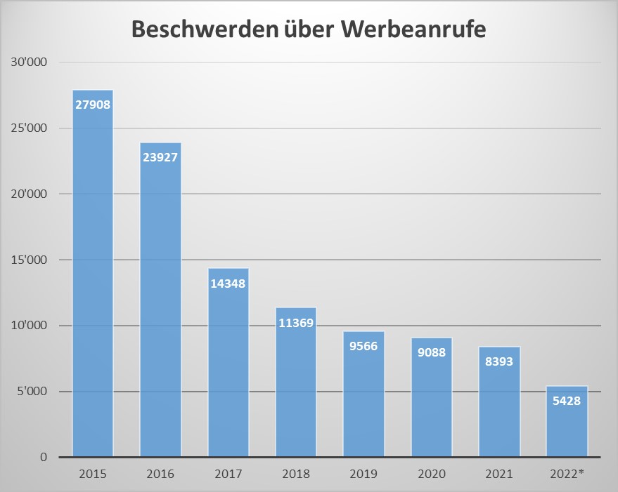 Die Anzahl Beschwerden über Werbeanrufe trotz Sterneintrag im Telefonbuch, die beim Staatssekretariat für Wirtschaft (SECO) eingehen, haben in den letzten Jahren deutlich abgenommen. Waren es im Jahr 2015 noch fast 28’000 Beschwerden, gingen diese kontinuierlich zurück. Im ersten Halbjahr 2022 gab es nur noch 2’714 Meldungen – hochgerechnet auf das ganze Jahr rund 5500 (siehe Abbildung 1). «In den letzten sieben Jahren haben sich die Beschwerden über unerwünschte Werbeanrufe um über 80% reduziert», konstatiert Nadine Masshardt, Präsidentin des Konsumentenschutzes.