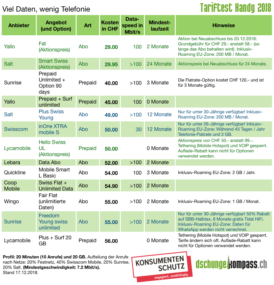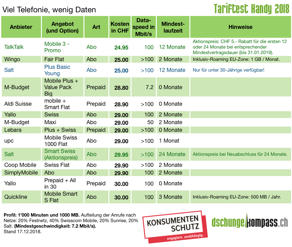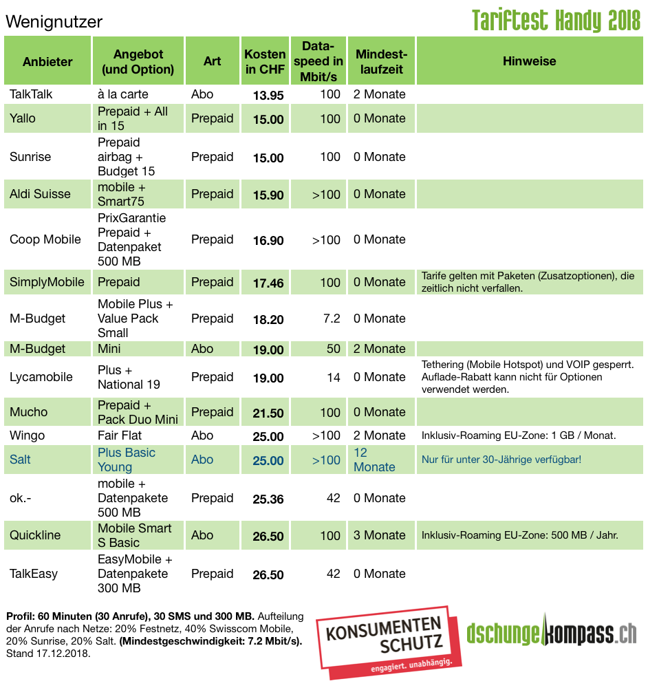 Der Tariftest Handy von dschungelkompass.ch und dem Konsumentenschutz basiert auf vier Nutzerprofilen, die sich in Bezug auf das Gesprächs- und Datenvolumen (Internetnutzung) unterscheiden. Berücksichtigt wurden alle relevanten Anbieter von Mobilfunk-Abos und Prepaid-Angeboten für Privatpersonen in der Schweiz. Dies sind Aldi Mobile, Coop Mobile, Lebara, Lycamobile, M-Budget, ok.- mobile, Quickline, Salt, SimplyMobile, Sunrise, Swisscom, TalkEasy, TalkTalk, UPC, Wingo und yallo. Sofern vorhanden wird pro Anbieter jeweils das günstigste Abo, das günstigste Jugend-Abo und das günstigste Prepaid-Angebot aufgelistet. Aktionspreise wurden berücksichtigt und speziell gezeichnet. Kombirabatte, die in Kombination mit einem Festnetz-Angebot oder für mehrere Personen im gleichen Haushalt gelten, wurden nicht berücksichtigt.