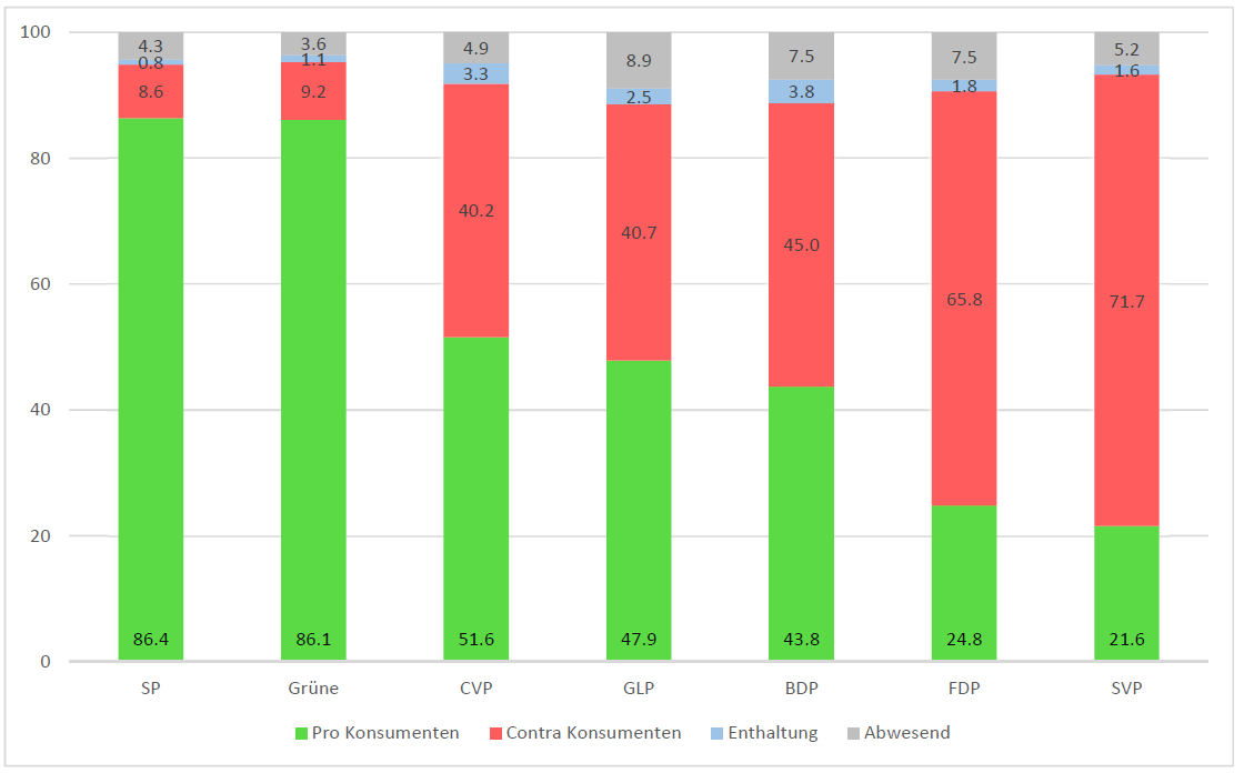 Das Parlamentarierrating der Allianz der Konsumentenschutz-Organisationen (Konsumentenschutz, FRC, ACSI) zeigt, dass die Unterstützung für Konsumentenanliegen im Nationalrat in der laufenden Legislatur (2015-2019) bei der SP und den Grünen am grössten war. Die Mitglieder dieser beiden Parteien stimmten in rund 86% der Fälle für die Interessen der KonsumentInnen. Im Mittelfeld landen die CVP, GLP und BDP. FDP und SVP stimmten in dieser Legislatur am häufigsten gegen die Interessen der KonsumentInnen.