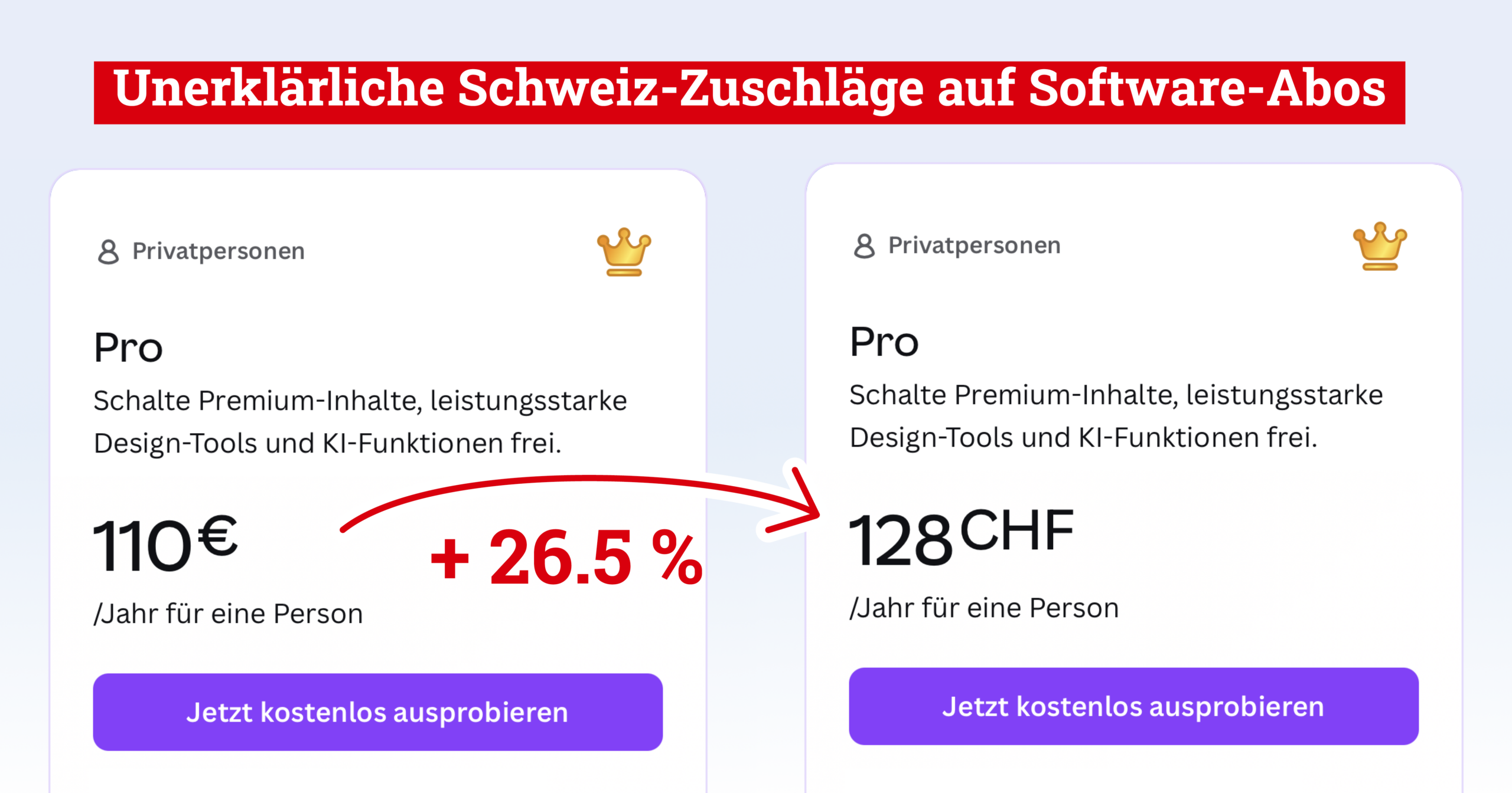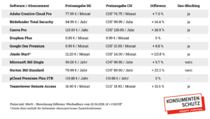 Software-Abonnemente kosten in der Schweiz oft deutlich mehr als in Deutschland. Plausible Erklärungen für die mitunter massiven Preisunterschiede gibt es keine. Zudem verhindern einige Anbieter:innen aktiv, dass ihre Angebote aus der Schweiz zum Euro-Preis abonniert werden können. Dies stuft der Konsumentenschutz als widerrechtlich ein und fordert die betroffenen Unternehmen auf, das sogenannte Geoblocking einzustellen.