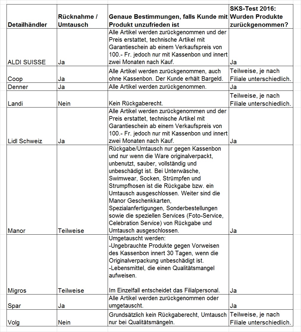 Bei der Migros wurden in beiden Filialen die beanstandeten Produkte zurückgenommen, dies obwohl sich die Migros offiziell nicht dazu verpflichtet. Bei Volg und auch bei der Landi, die beide keine Rücknahme-Garantie kennen, wurde das Begehren unterschiedlich gehandhabt. In einer Filiale wurden die Produkte zurückgenommen, in der anderen nicht. SKS-Geschäftsleiterin Sara Stalder meint: „Die Beispiele Migros, Volg und Landi zeigen, dass ein Kunde auch in Fällen auf Kulanz hoffen darf, in denen offiziell kein Umtausch vorgesehen ist.“