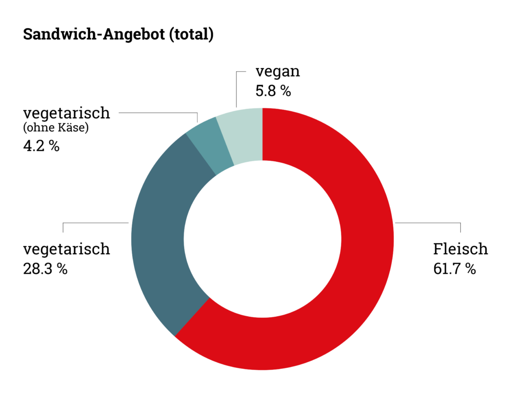In den fünf Bahnhöfen von Burgdorf, Kloten, Liestal, Solothurn und Visp hat der Konsumentenschutz insgesamt 431 Sandwich-Sorten gezählt. Davon enthalten 266 Sandwiches (62 %) Fleisch oder Fisch, 122 (28 %) sind vegetarisch. Vegetarische Sandwiches ohne Käse gibt es 18 (4 %) und gerade noch 25 (6 %) sind vegan. Ein beachtlicher Anteil? Relativ, denn diese 25 vegane Sandwiches sind ungleich verteilt. Elf davon sind in Solothurn zu kaufen, die restlichen 14 fallen auf vier Orte. Und pro besuchtem Laden sind es durchschnittlich gerade 1,4 vegane Sorten, die der Konsumentenschutz vorgefunden hat. In fünf Läden ist gar kein veganes Sandwich erhältlich.