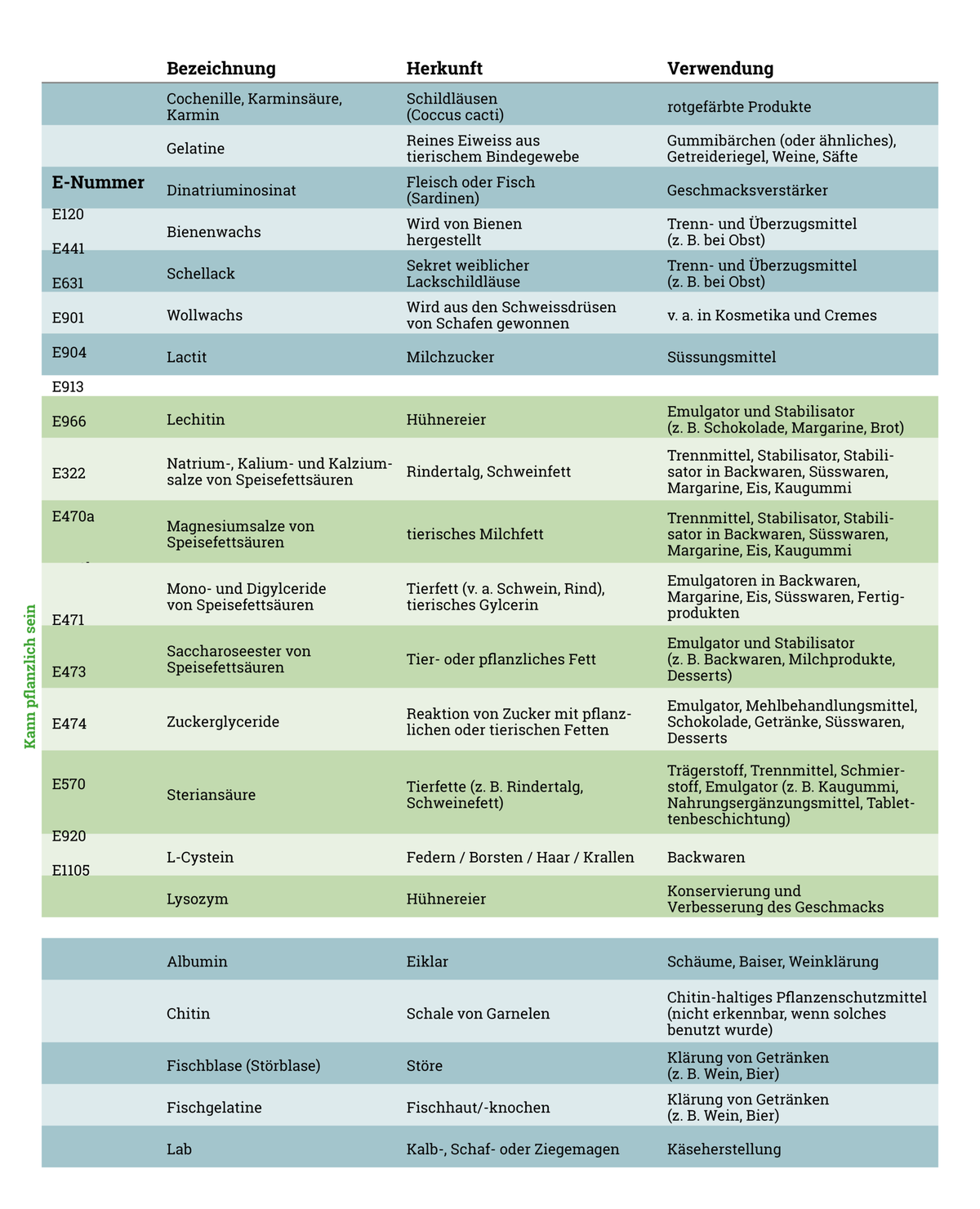 Um bewusst auswählen zu können, ist es nützlich, sich mit den E-Nummern und Begriffen auseinanderzusetzen. Schwierig ist es bei den Stoffen, die pflanzlichen oder tierischen Ursprungs sein können. Um die Orientierung zu erleichtern, finden Sie hier eine Übersicht der häufigsten Lebensmittel, in denen diese Zusatzstoffe vorkommen können: