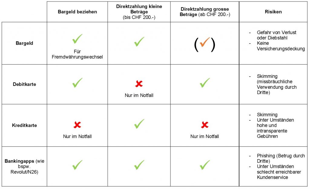 Wer in den Urlaub fährt oder auf Geschäftsreise geht, muss sich gut vorbereiten: Neben dem Gepäck braucht es einen gültigen Reisepass, die wichtigsten Dokumente und Unterlagen und vor allem: (ein) brauchbare(s) Zahlungsmittel. In diesem Artikel wird aufgezeigt, welche Möglichkeiten es gibt, im Ausland zu bezahlen, und worauf man dabei punkto Sicherheit und Kosten achten sollte.