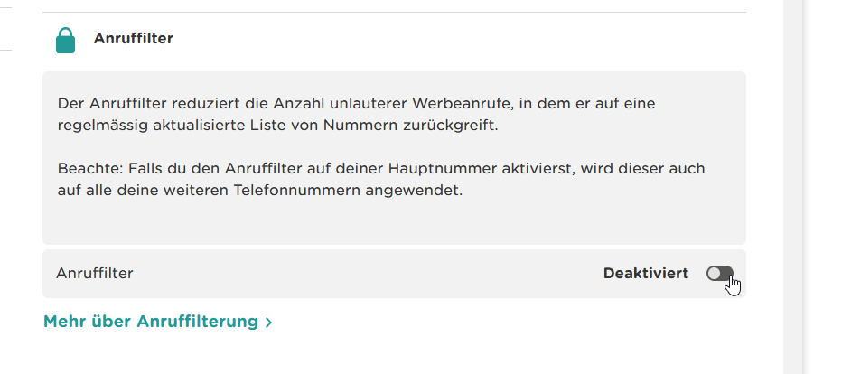 Bei Salt ist der Werbeanruffilter bereits aktiviert. Als Kunde müssen Sie nichts unternehmen. Falls Sie den Filter deaktivieren wollen, können Sie dies tun unter Mein Konto / Abonnements / Optionen / Marketing-Anrufe zulassen.