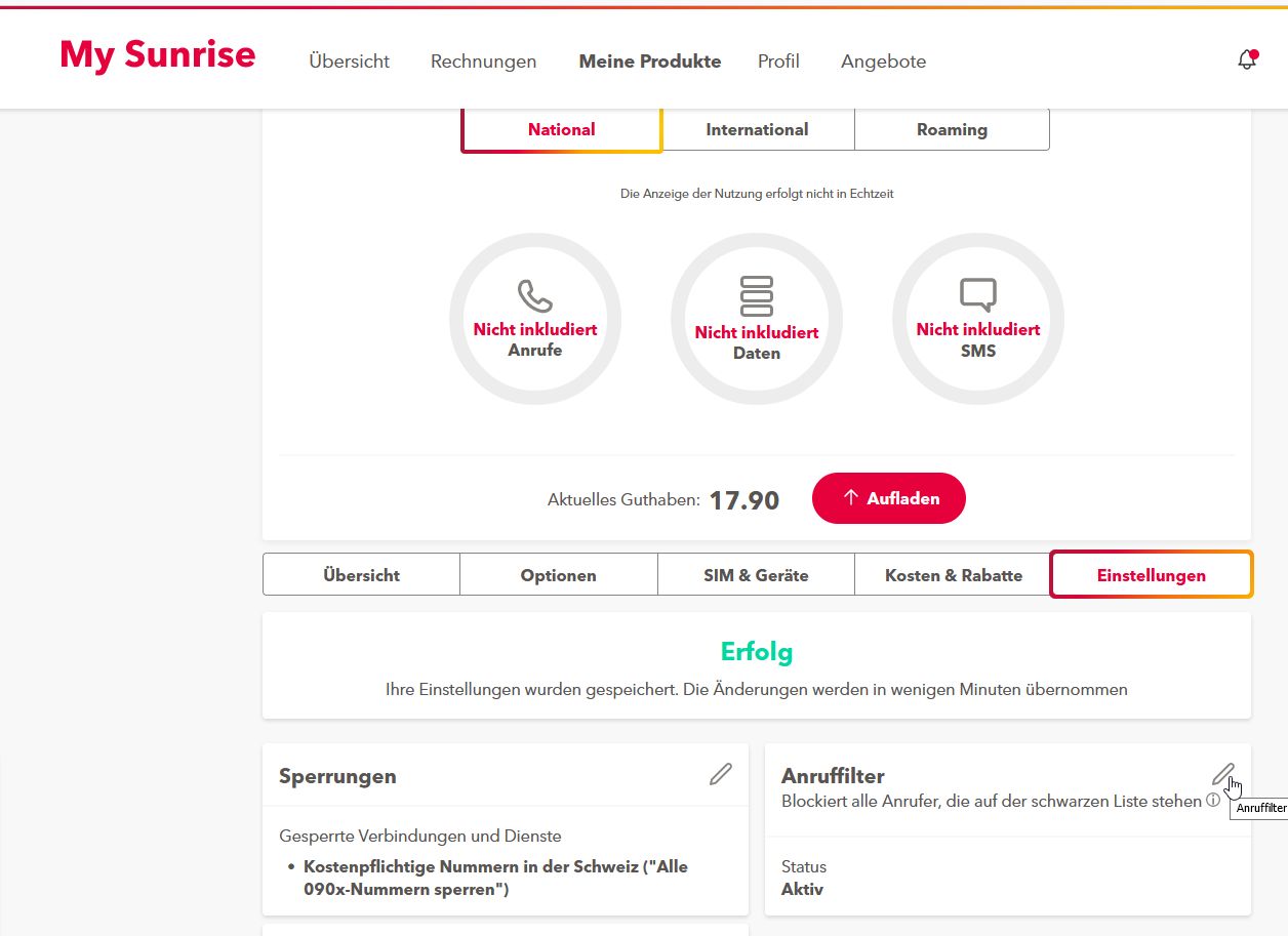 Bei Sunrise UPC ist nur ein Basisfilter automatisch aufgeschaltet. Um effektiv vor Werbeanrufen geschützt zu sein, müssen die Kunden einen zusätzlichen Filter selber aktivieren. Sunrise-Kunden können den Anruffilter in ihrem Konto unter Meine Produkte / Einstellungen / Anruffilter aktivieren. Falls Sie mehrere Handy-Nummern haben, müssen Sie den Filter für jede Nummer einzeln aktivieren. Weiterführende Infos von Sunrise (siehe unerwünschte Werbung). Auch bei anderen Anbietern, die das Sunrise-Netz nutzen, lässt sich der Anruffilter aktivieren, er heisst dort „Call Filter“: Yallo, Lebara, ALDI SUISSE mobile.