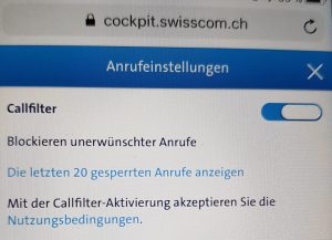 Seit 1. Juli 2021 müssen alle Telekom-Anbieter ihren Kunden einen Werbeanruf-Filter anbieten. Ähnlich wie bei den Spam-Filtern bei E-Mails werden so unerwünschte Werbeanrufe vom Anbieter blockiert und gar nicht mehr zum Kunden durchgestellt. Kunden von Swisscom, Wingo, Coop Mobile, M-Budget, Sunrise UPC, Yallo und Lebara müssen den sogenannten Callfilter selber einschalten. Bei Kunden von Salt und Quickline ist der Werbeanruf-Filter automatisch eingeschaltet – die Kunden müssen nichts unternehmen. Die Filter sind ein sehr gutes Mittel um lästige Werbeanrufe zu reduzieren – einen 100%-Schutz gibt es allerdings nicht. Nicht gefiltert werden legale Werbeanrufe von seriösen Anbietern (z.B. Umfragen). Verlangen Sie bei solchen Anrufen, dass Ihre Nummer aus der Datenbank gestrichen wird, wenn Sie nicht mehr kontaktiert werden möchten und versehen Sie Ihre Telefonnummer mit einem Sterneintrag oder lassen sie noch besser aus dem Telefonverzeichnis löschen, falls Sie dies noch nicht getan haben. Als Zusatzmassnahme zu den Werbeanruf-Filtern können die Konsumenten auch selber Nummern blockieren (siehe Kasten am Ende des Beitrags).